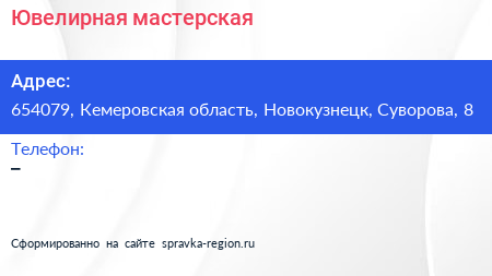 Ювелирная мастерская по адресу 654079, Кемеровская область, Новокузнецк, Суворова, 8 в дальнейшем Организация, размещена в следующих категориях:
