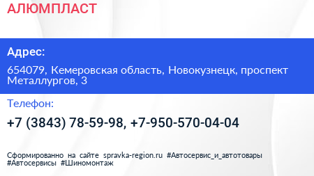 АЛЮМПЛАСТ по адресу 654079, Кемеровская область, Новокузнецк, проспект Металлургов, 3 в дальнейшем Организация, размещена в следующих категориях: