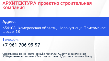 АРХИТЕКТУРА, проектно-строительная компания по адресу 654103, Кемеровская область, Новокузнецк, Притомское шоссе, 18 в дальнейшем Организация, размещена в следующих категориях: