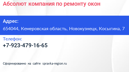 Абсолют, компания по ремонту окон по адресу 654044, Кемеровская область, Новокузнецк, Косыгина, 7 в дальнейшем Организация, размещена в следующих категориях: