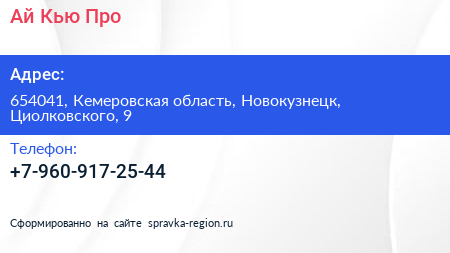 Ай Кью Про по адресу 654041, Кемеровская область, Новокузнецк, Циолковского, 9 в дальнейшем Организация, размещена в следующих категориях: