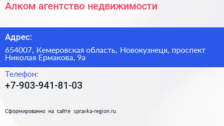 Алком, агентство недвижимости по адресу 654007, Кемеровская область, Новокузнецк, проспект Николая Ермакова, 9а в дальнейшем Организация, размещена в следующих категориях: