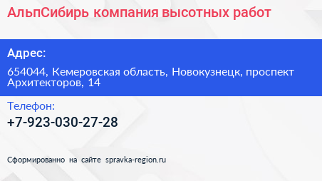 АльпСибирь, компания высотных работ по адресу 654044, Кемеровская область, Новокузнецк, проспект Архитекторов, 14 в дальнейшем Организация, размещена в следующих категориях:
