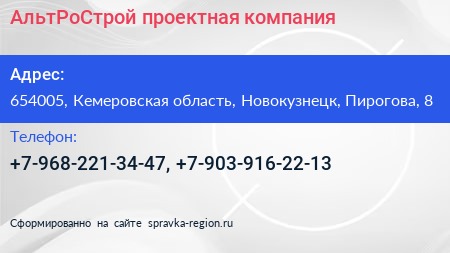 АльтРоСтрой, проектная компания по адресу 654005, Кемеровская область, Новокузнецк, Пирогова, 8 в дальнейшем Организация, размещена в следующих категориях: