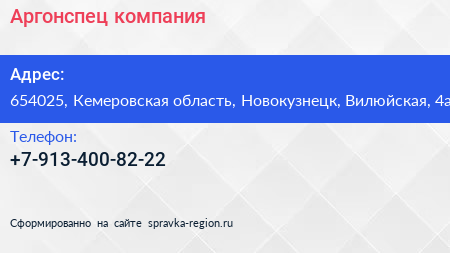 Аргонспец, компания по адресу 654025, Кемеровская область, Новокузнецк, Вилюйская, 4а в дальнейшем Организация, размещена в следующих категориях: