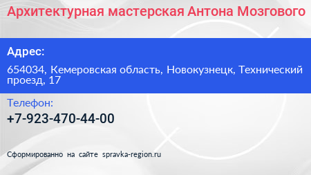 Архитектурная мастерская Антона Мозгового по адресу 654034, Кемеровская область, Новокузнецк, Технический проезд, 17 в дальнейшем Организация, размещена в следующих категориях: