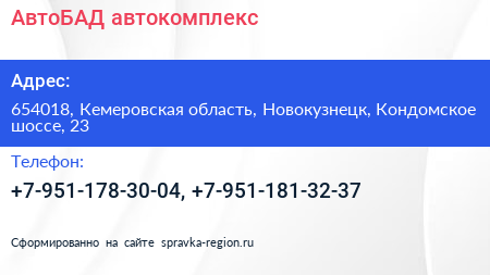 АвтоБАД, автокомплекс по адресу 654018, Кемеровская область, Новокузнецк, Кондомское шоссе, 23 в дальнейшем Организация, размещена в следующих категориях:
