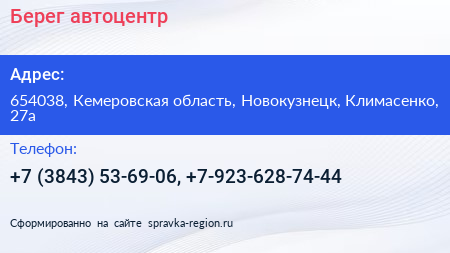 Берег, автоцентр по адресу 654038, Кемеровская область, Новокузнецк, Климасенко, 27а в дальнейшем Организация, размещена в следующих категориях: