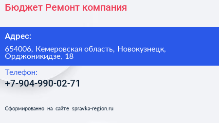 Бюджет-Ремонт, компания по адресу 654006, Кемеровская область, Новокузнецк, Орджоникидзе, 18 в дальнейшем Организация, размещена в следующих категориях: