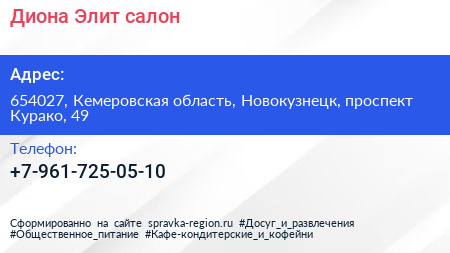Диона Элит, салон по адресу 654027, Кемеровская область, Новокузнецк, проспект Курако, 49 в дальнейшем Организация, размещена в следующих категориях: