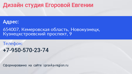 Дизайн-студия Егоровой Евгении по адресу 654007, Кемеровская область, Новокузнецк, Кузнецкстроевский проспект, 9 в дальнейшем Организация, размещена в следующих категориях: