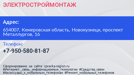 ЭЛЕКТРОСТРОЙМОНТАЖ по адресу 654007, Кемеровская область, Новокузнецк, проспект Металлургов, 16 в дальнейшем Организация, размещена в следующих категориях: