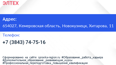 ЭЛТЕХ по адресу 654027, Кемеровская область, Новокузнецк, Хитарова, 11 в дальнейшем Организация, размещена в следующих категориях: