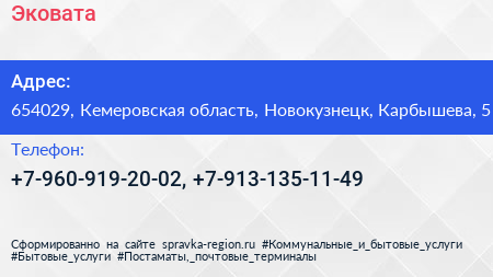 Эковата по адресу 654029, Кемеровская область, Новокузнецк, Карбышева, 5 в дальнейшем Организация, размещена в следующих категориях: