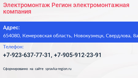 Электромонтаж-Регион, электромонтажная компания по адресу 654080, Кемеровская область, Новокузнецк, Свердлова, 8а в дальнейшем Организация, размещена в следующих категориях: