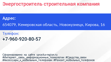 Энергостроитель, строительная компания по адресу 654079, Кемеровская область, Новокузнецк, Кирова, 16 в дальнейшем Организация, размещена в следующих категориях: