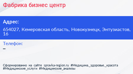 Фабрика, бизнес-центр по адресу 654027, Кемеровская область, Новокузнецк, Энтузиастов, 16 в дальнейшем Организация, размещена в следующих категориях: