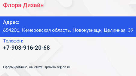 Флора+Дизайн по адресу 654201, Кемеровская область, Новокузнецк, Целинная, 39 в дальнейшем Организация, размещена в следующих категориях: