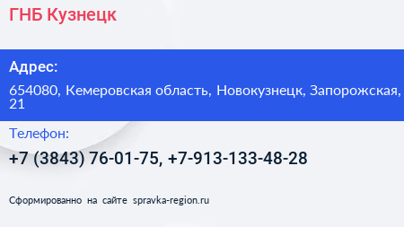 ГНБ Кузнецк по адресу 654080, Кемеровская область, Новокузнецк, Запорожская, 21 в дальнейшем Организация, размещена в следующих категориях: