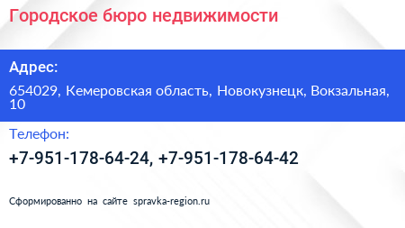 Городское бюро недвижимости по адресу 654029, Кемеровская область, Новокузнецк, Вокзальная, 10 в дальнейшем Организация, размещена в следующих категориях:
