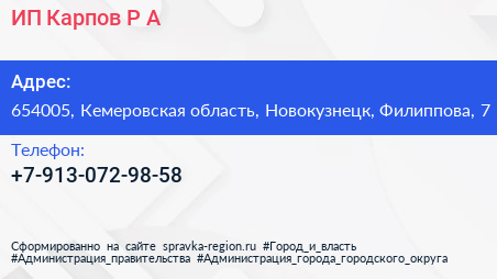 ИП Карпов Р.А. по адресу 654005, Кемеровская область, Новокузнецк, Филиппова, 7 в дальнейшем Организация, размещена в следующих категориях: