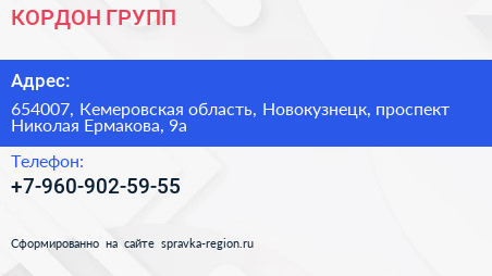 КОРДОН ГРУПП по адресу 654007, Кемеровская область, Новокузнецк, проспект Николая Ермакова, 9а в дальнейшем Организация, размещена в следующих категориях: