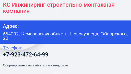 КС-Инжиниринг, строительно-монтажная компания по адресу 654032, Кемеровская область, Новокузнецк, Обнорского, 22 в дальнейшем Организация, размещена в следующих категориях: