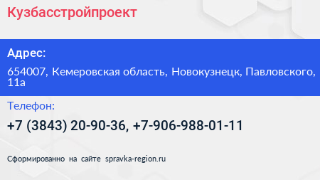 Кузбасстройпроект по адресу 654007, Кемеровская область, Новокузнецк, Павловского, 11а в дальнейшем Организация, размещена в следующих категориях: