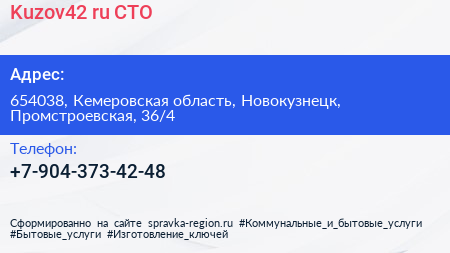Kuzov42.ru, СТО по адресу 654038, Кемеровская область, Новокузнецк, Промстроевская, 36/4 в дальнейшем Организация, размещена в следующих категориях: