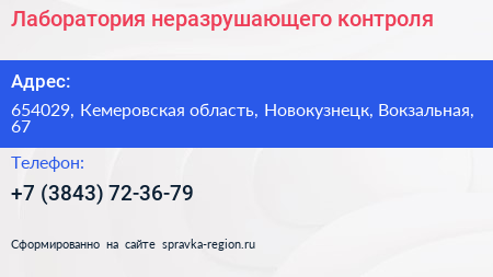 Лаборатория неразрушающего контроля по адресу 654029, Кемеровская область, Новокузнецк, Вокзальная, 67 в дальнейшем Организация, размещена в следующих категориях: