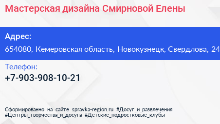 Мастерская дизайна Смирновой Елены по адресу 654080, Кемеровская область, Новокузнецк, Свердлова, 24 в дальнейшем Организация, размещена в следующих категориях: