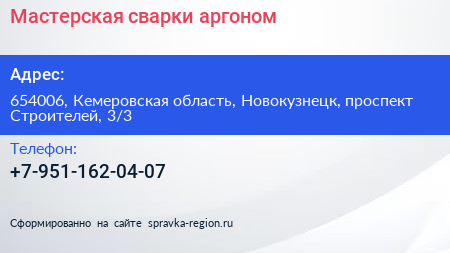 Мастерская сварки аргоном по адресу 654006, Кемеровская область, Новокузнецк, проспект Строителей, 3/3 в дальнейшем Организация, размещена в следующих категориях: