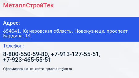 МеталлСтройТек по адресу 654041, Кемеровская область, Новокузнецк, проспект Бардина, 14 в дальнейшем Организация, размещена в следующих категориях: