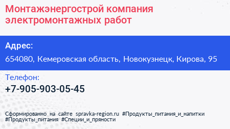 Монтажэнергострой, компания электромонтажных работ по адресу 654080, Кемеровская область, Новокузнецк, Кирова, 95 в дальнейшем Организация, размещена в следующих категориях:
