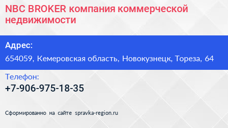 NBC-BROKER, компания коммерческой недвижимости по адресу 654059, Кемеровская область, Новокузнецк, Тореза, 64 в дальнейшем Организация, размещена в следующих категориях: