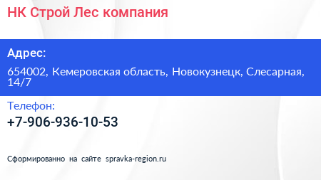 НК-Строй Лес, компания по адресу 654002, Кемеровская область, Новокузнецк, Слесарная, 14/7 в дальнейшем Организация, размещена в следующих категориях: