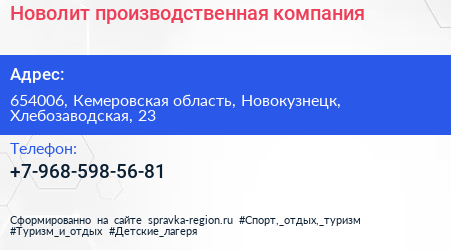 Новолит, производственная компания по адресу 654006, Кемеровская область, Новокузнецк, Хлебозаводская, 23 в дальнейшем Организация, размещена в следующих категориях: