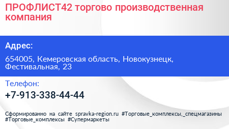 ПРОФЛИСТ42, торгово-производственная компания по адресу 654005, Кемеровская область, Новокузнецк, Фестивальная, 23 в дальнейшем Организация, размещена в следующих категориях: