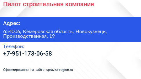Пилот, строительная компания по адресу 654006, Кемеровская область, Новокузнецк, Производственная, 19 в дальнейшем Организация, размещена в следующих категориях: