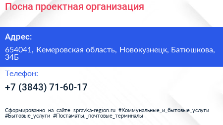 Посна, проектная организация по адресу 654041, Кемеровская область, Новокузнецк, Батюшкова, 34Б в дальнейшем Организация, размещена в следующих категориях: