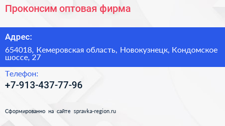 Проконсим, оптовая фирма по адресу 654018, Кемеровская область, Новокузнецк, Кондомское шоссе, 27 в дальнейшем Организация, размещена в следующих категориях: