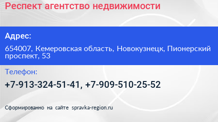 Респект, агентство недвижимости по адресу 654007, Кемеровская область, Новокузнецк, Пионерский проспект, 53 в дальнейшем Организация, размещена в следующих категориях: