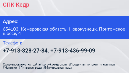 СПК Кедр по адресу 654103, Кемеровская область, Новокузнецк, Притомское шоссе, 4 в дальнейшем Организация, размещена в следующих категориях: