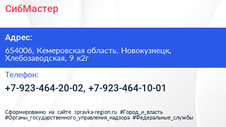 СибМастер по адресу 654006, Кемеровская область, Новокузнецк, Хлебозаводская, 9 к2г в дальнейшем Организация, размещена в следующих категориях: