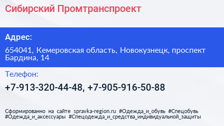Сибирский Промтранспроект по адресу 654041, Кемеровская область, Новокузнецк, проспект Бардина, 14 в дальнейшем Организация, размещена в следующих категориях: