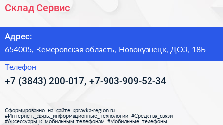 Склад-Сервис по адресу 654005, Кемеровская область, Новокузнецк, ДОЗ, 18Б в дальнейшем Организация, размещена в следующих категориях:
