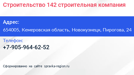 Строительство 142, строительная компания по адресу 654005, Кемеровская область, Новокузнецк, Пирогова, 24 в дальнейшем Организация, размещена в следующих категориях: