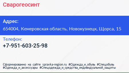 Сварогеосинт по адресу 654004, Кемеровская область, Новокузнецк, Щорса, 15 в дальнейшем Организация, размещена в следующих категориях: