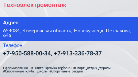 Техноэлектромонтаж по адресу 654034, Кемеровская область, Новокузнецк, Петракова, 64а в дальнейшем Организация, размещена в следующих категориях: