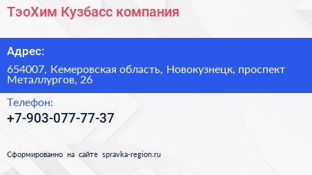 ТэоХим Кузбасс, компания по адресу 654007, Кемеровская область, Новокузнецк, проспект Металлургов, 26 в дальнейшем Организация, размещена в следующих категориях: